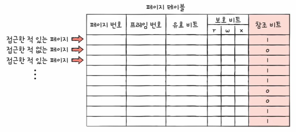- 참조 비트가 0 : 적재 이후 CPU가 한 번도 읽거나 쓴 적이 없는 페이지를 뜻함