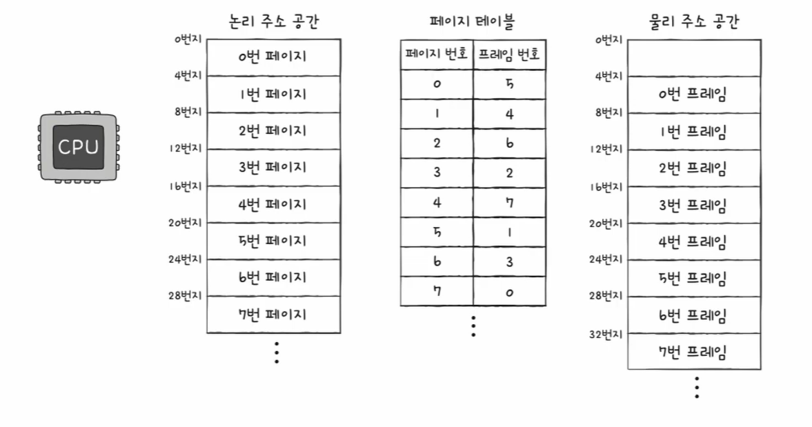 - <페이지 번호, 변위>로 이뤄진 논리 주소는 페이지 테이블을 통해 <프레임 번호, 변위>로 이뤄진 물리 주소로 변환된다.