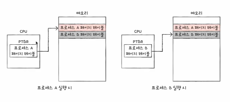 각 프로세스들의 페이지 테이블 정보들은 각 프로세스 PCB에 기록된다. 그리고 프로세스의 문맥 교환이 일어날 때 다른 레지스터와 마찬가지로 함께 변경된다.