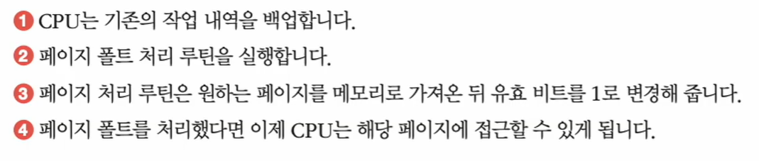 페이지 폴트(page fault) CPU가 유효 비트가 0인 메모리(메모리에 적재되어 있지 않은 페이지)에 접근하려고 하면 페이지 폴트라는 예외(Exception)가 발생한다. CPU가 페이지 폴트를 처리하는 과정은 하드웨어 인터럽트를 처리하는 과정과 유사하다