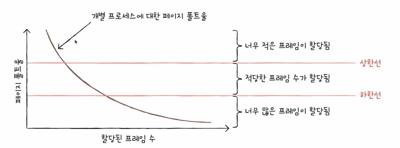 그렇기에 운영체제는 각 프로세스들이 무리 없이 실행하기 위한 최소한의 프레임 수를 파악하고 프로세스들에게 적절한 수만큼 프레임을 할당해 줄 수 있어야 한다.