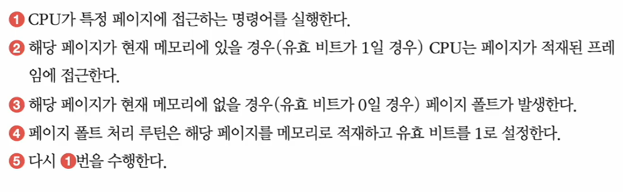 메모리가 가득 찬 상황에서 당장 실행에 필요한 페이지를 적재하려면 기존에 적재된 페이지를 보조기억장치로 내보내야 한다.