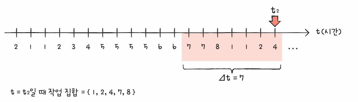 작업 집합을 구하는 방법 작업 집합 : 프로세스가 일정 기간 동안 참조한 페이지 집합