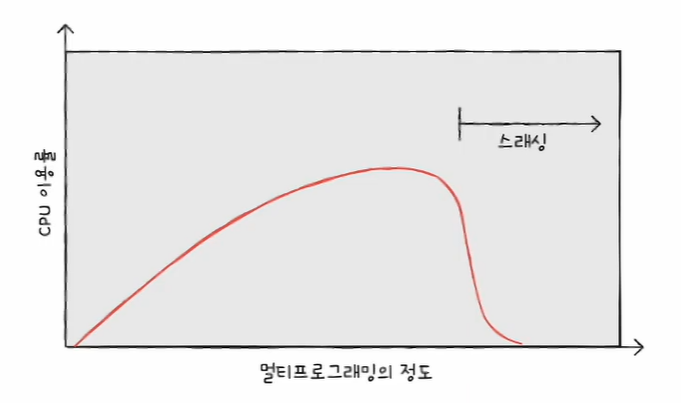 이 그래프는 동시에 실행되는 프로세스의 수를 늘린다고 해서 CPU 이용률이 비례해서 증가하는 것이 아님을 나타냄