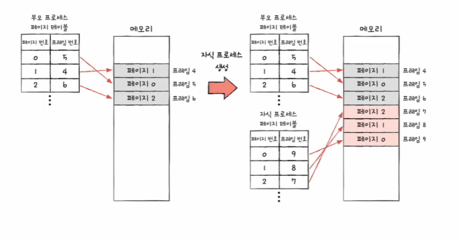 이로써 굳이 부모 프로세스의 메모리 공간을 복사하지 않고도 동일한 코드 및 데이터 영역을 가리킬 수 있다.