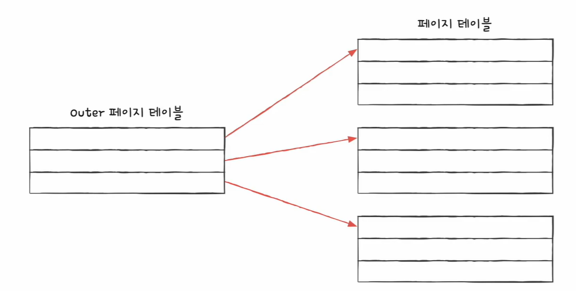 outer 페이지 테이블은 메모리에 항상 적재하고 일부분의 페이지 테이블이 필요하다면 outer페이지를 이용하여 일부분의 페이지 테이블만 메모리에 적재하는 것이다.