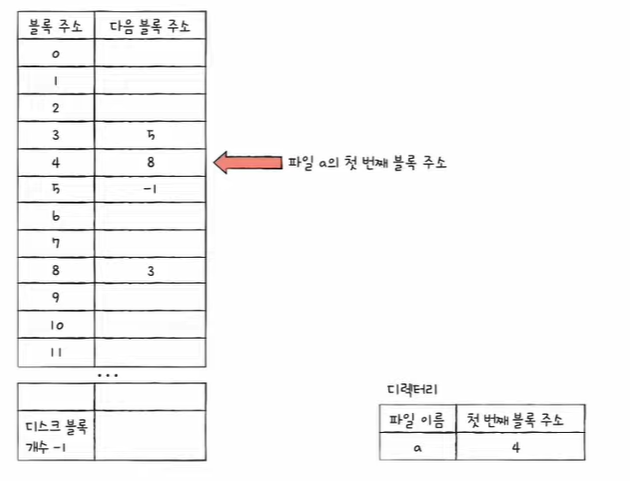 - 파일을 이루는 데이터 블록을 연결 리스트로 관리