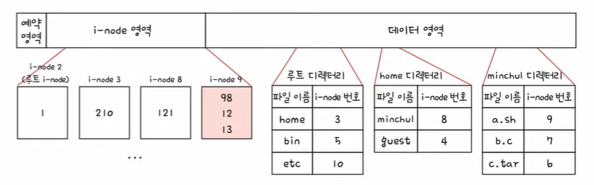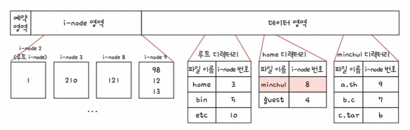 - 다음에 서브 디렉터리와 파일들을 위한 영역