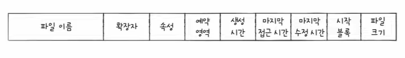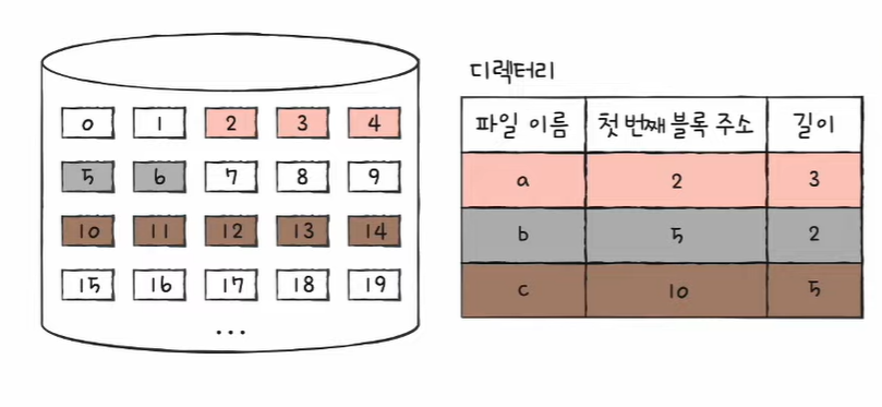- 디렉터리 엔트리 : 파일이름 & 첫 번째 블록 주소 & 블록 단위의 길이