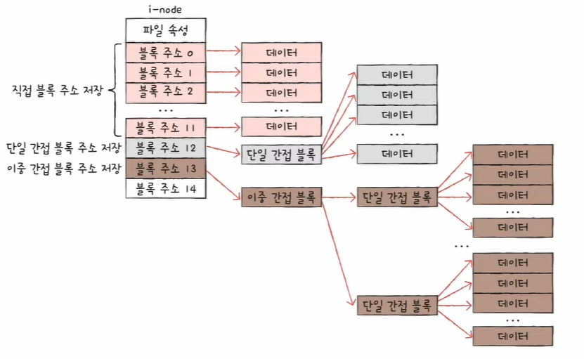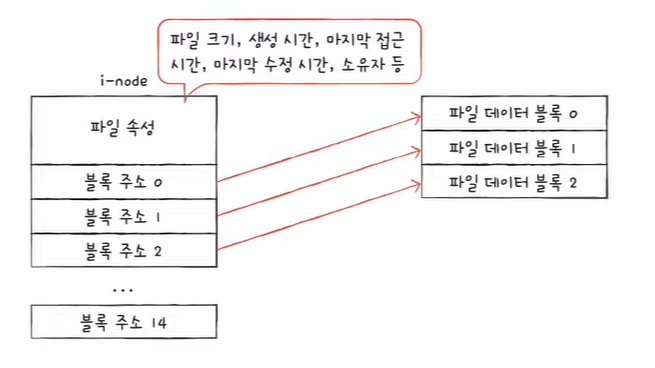 - i-node에는 파일 속성 정보와 열다섯 개의 블록 주소가 저장될 수 있다.