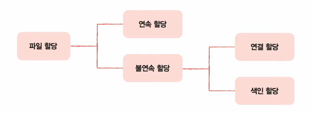 파일을 보조기억장치에 할당하는 방법에는 크게 연속 할당과 불연속 할당이 있고, 불연속 할당에는 크게 연결 할당과 색인 할당이 있다.