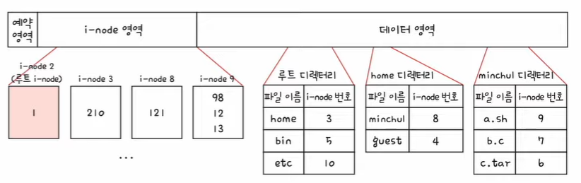 - 아래의 그림은 2번 i-node가 루트 디렉터리의 i-node라고 가정