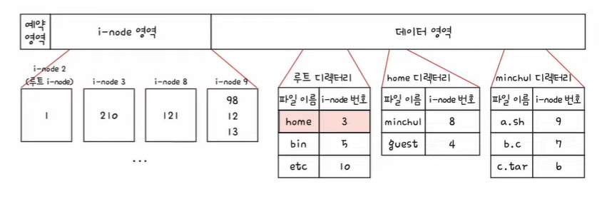 2. 루트 디렉터리 안에 home 디렉터리의 i-node는 3번 i-node이다.