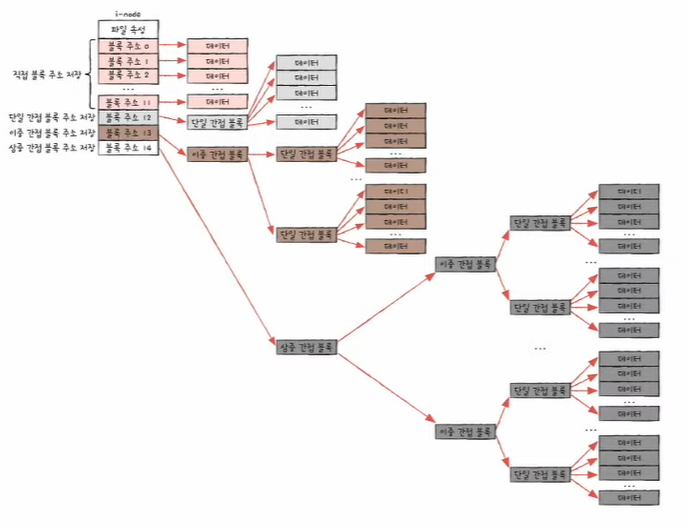 - 삼중 간접 블록 주소 : 이중 간접 블록들의 주소를 저장하는 블록