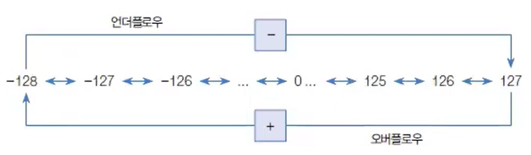 마찬가지로 -128에서 1을 빼면 -129가 되어 언더플로가 발생하는데, 연산 결과는 최대값인 127이 된다. 그리고 다시 1을 빼면 128이 된다.