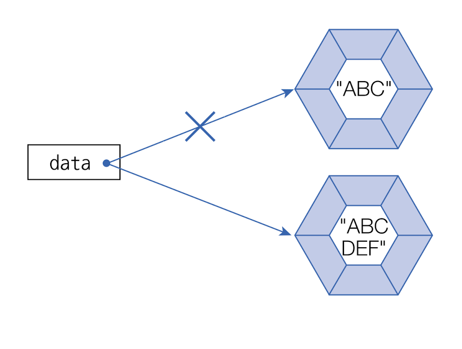 아래의 코드를 보면 다른 문자열을 결합해서 내부 문자열을 변경하는 것처럼 보이지만 사실 'ABCDEF'라는 새로운 String 객체를 생성하는 것이다. 그리고 data 변수는 새로 생성된 String 객체를 참조하게 된다.