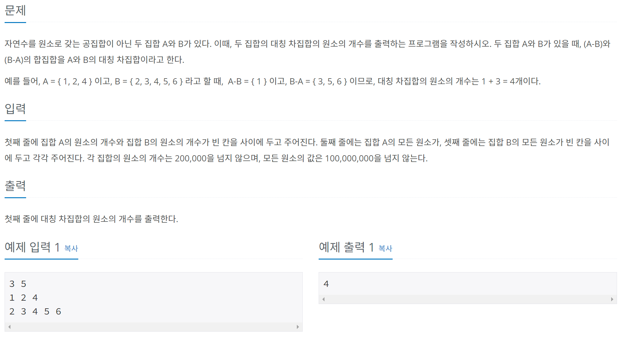 - 답 : (A집합 크기 - 교집합 개수) + (B집합 크기 - 교집합 개수)
