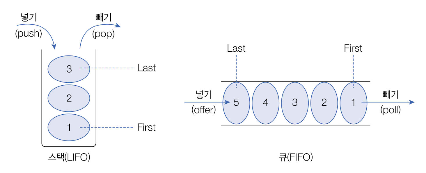 컬렉션 프레임워크는 LIFO 자료구조를 제공하는 스택 클래스와 FIFO 자료구조를 제공하는 큐 인터페이스를 제공하고 있다.