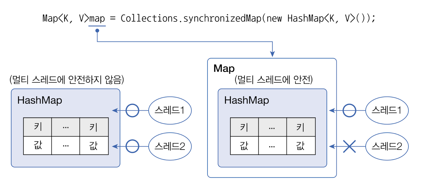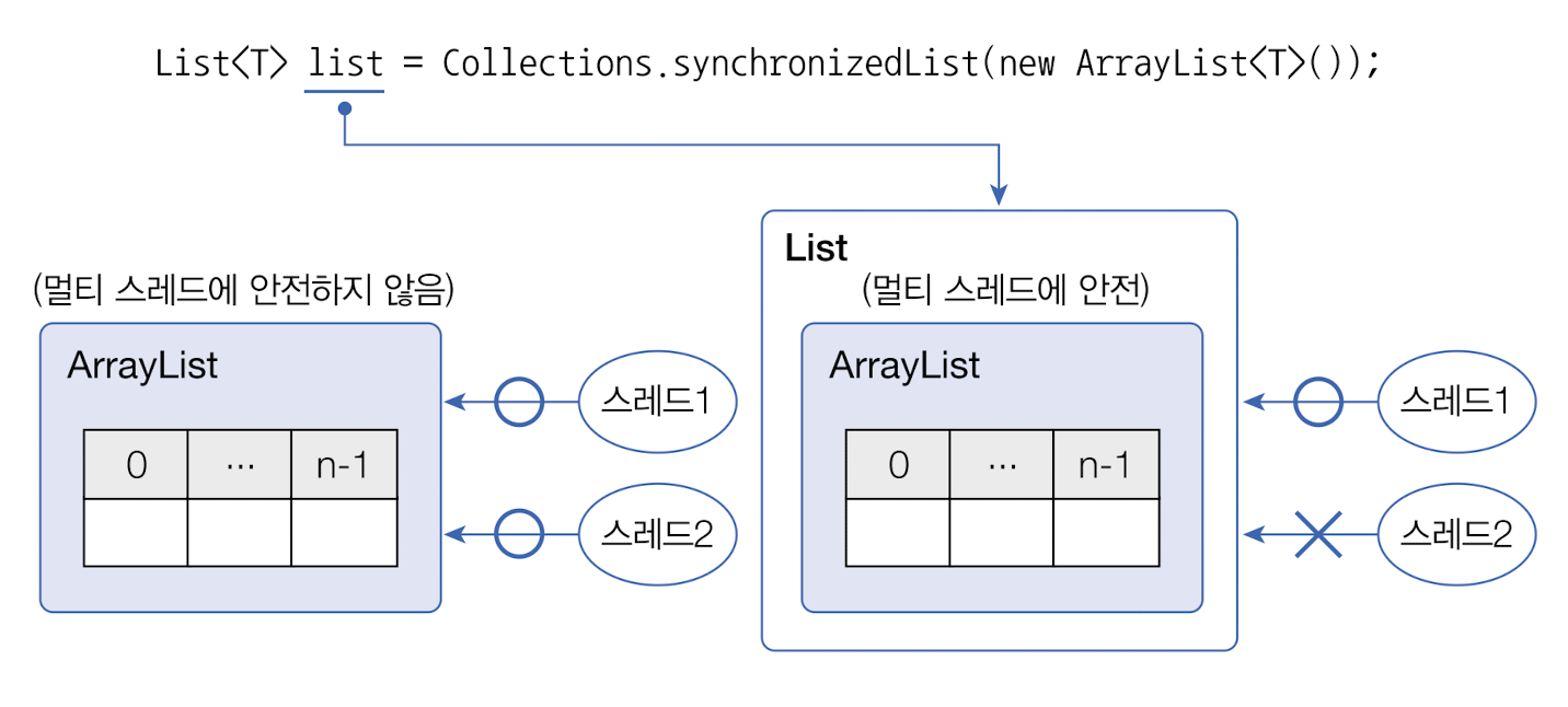 이런 경우를 대비해서 컬렉션 프레임워크는 비동기화된 메소드를 동기화된 메소드로 래핑하는 Collections의 synchronizedXXX() 메소드를 제공한다.