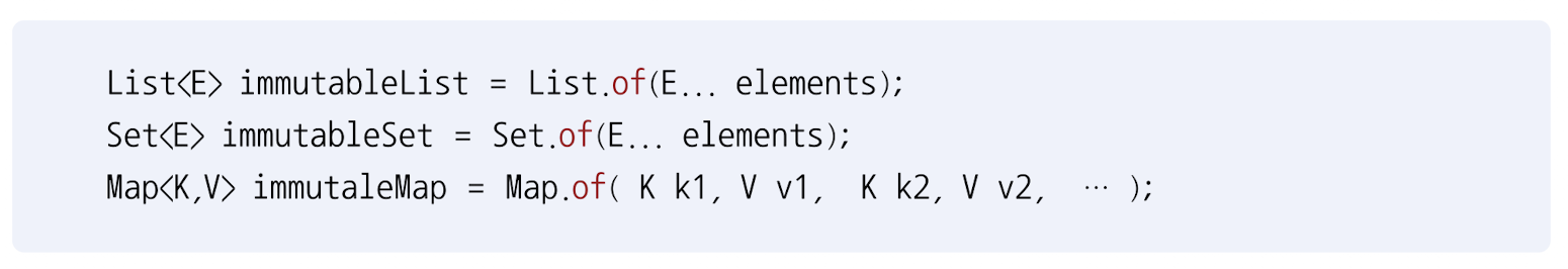 List, Set, Map 인터페이스의 정적 메소드인 of()로 수정할 수 없도록 할 수 있다.