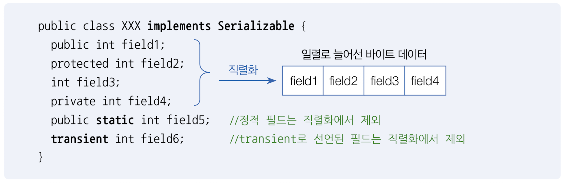 필드의 타입 또한 Serializable 인터페이스를 구현한 타입이어야 직렬화가 가능하다.