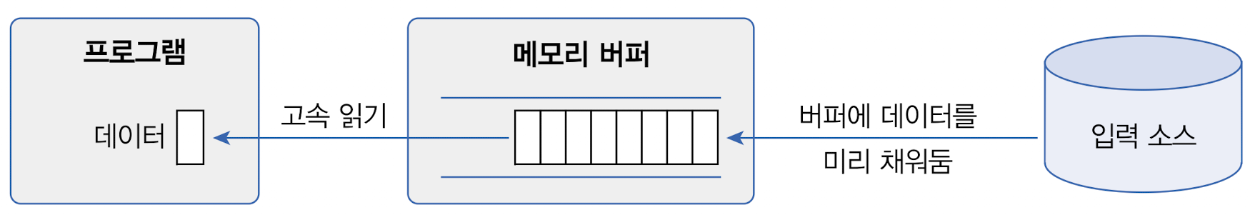 프로그램이 입출력 소스와 직접 작업하지 않고 중간에 메모리 버퍼와 작업함으로써 실행 성능을 향상시킬 수 있다.