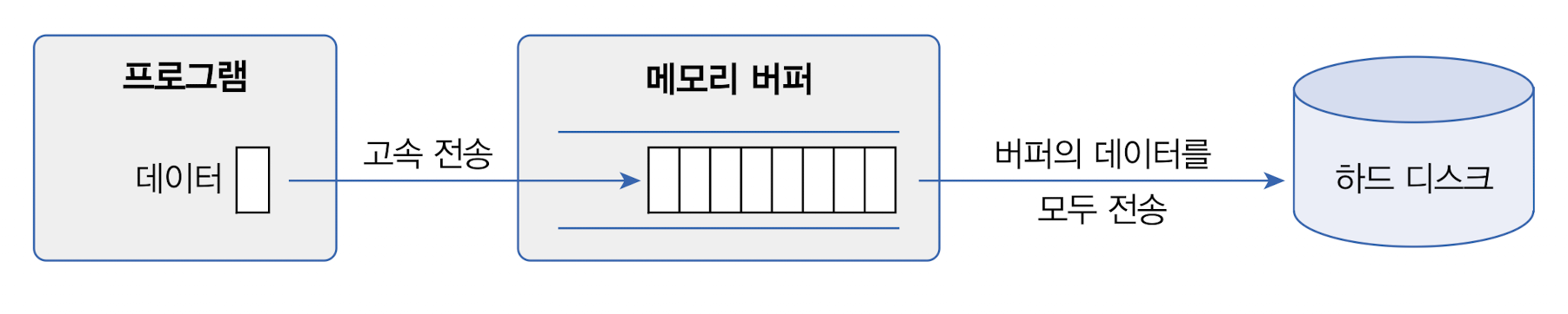 - 버퍼는 데이터가 쌓이기를 기다렸다가 꽉 차게 되면 데이터를 한꺼번에 하드 디스크로 보냄으로써 출력 횟수를 줄여준다.
