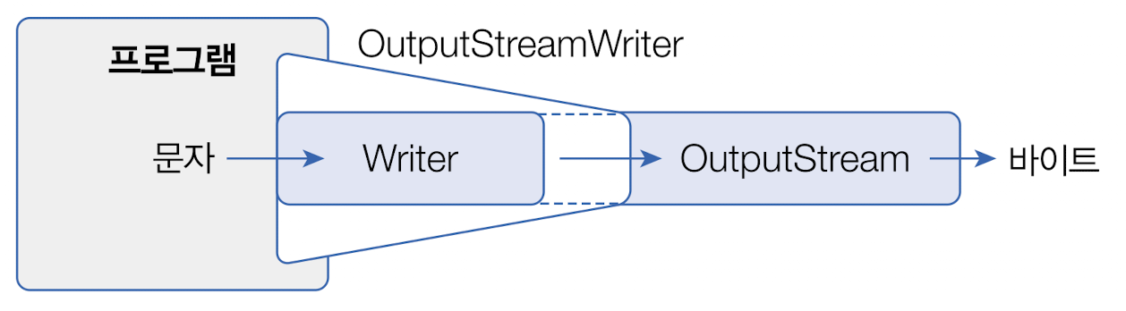 OutputStream을 Writer로 변환하려면 OutputStreamWriter 보조 스트림을 연결하면 된다.