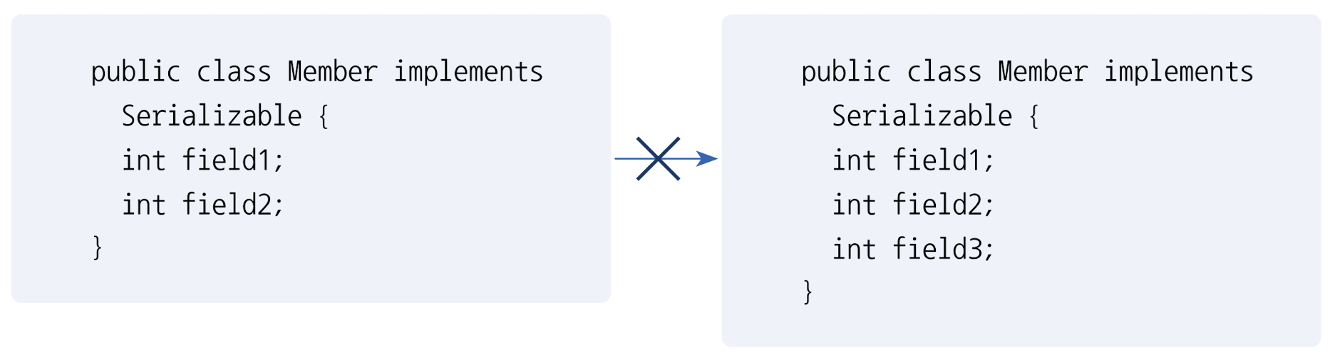 아래의 코드를 보면, 왼쪽 Member 클래스로 생성한 객체를 직렬화하면 오른쪽 Member 클래스로 역직렬화할 수 없다.