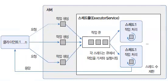 스레드풀은 작업 처리 스레드 수를 제한해서 사용하기 때문에 갑작스런 클라이언트 폭증이 발생해도 크게 문제가 되지 않는다.