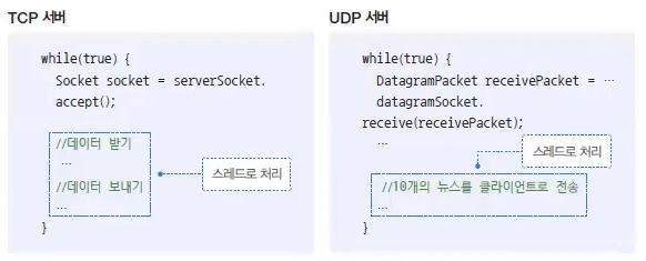 위와 같이 TCP와 UDP 서버에서는 accept()와 receive() 를 제외한 요청 처리 코드를 별도의 스레드에서 작업을 해야 서버에 들어오는 클라이언트의 무수한 요청을 동시에 처리할 수 있다.