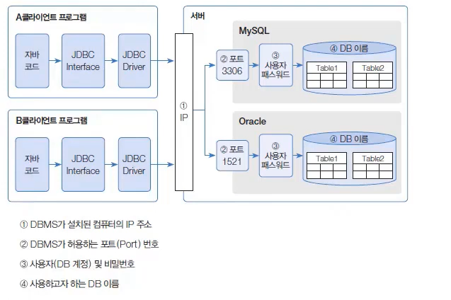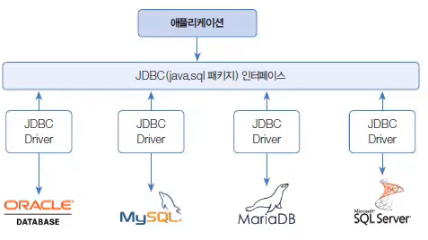 JDBC는 데이터베이스 관리시스템(DBMS)의 종류와 상관없이 동일하게 사용할 수 있는 클래스와 인터페이스로 구성되어 있다.