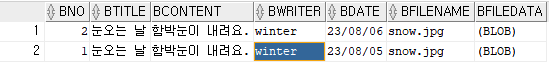 Board [bno=2, btitle=눈오는 날, bcontent=함박눈이 내려요., bwriter=winter, bdate=2023-08-06, bfilename=snow.jpg, bfiledata=oracle.sql.BLOB@305ffe9e]