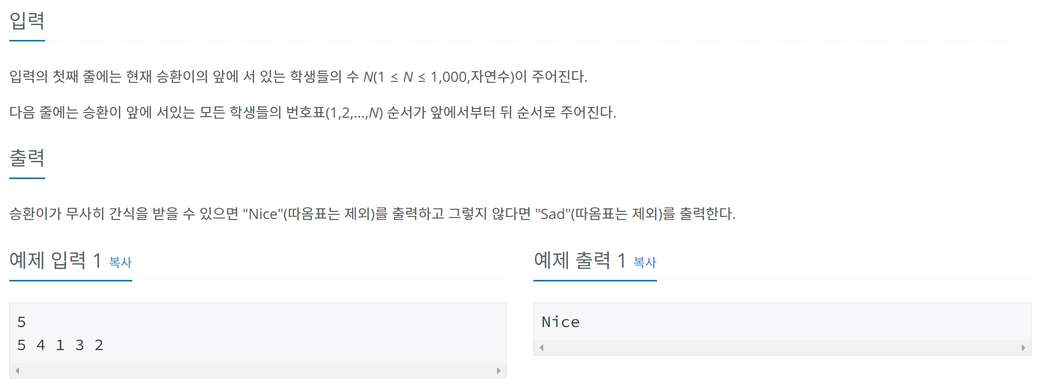 순서가 맞다면 스택 꼭대기를 제거하고, 틀리다면 Sad를 출력한다.