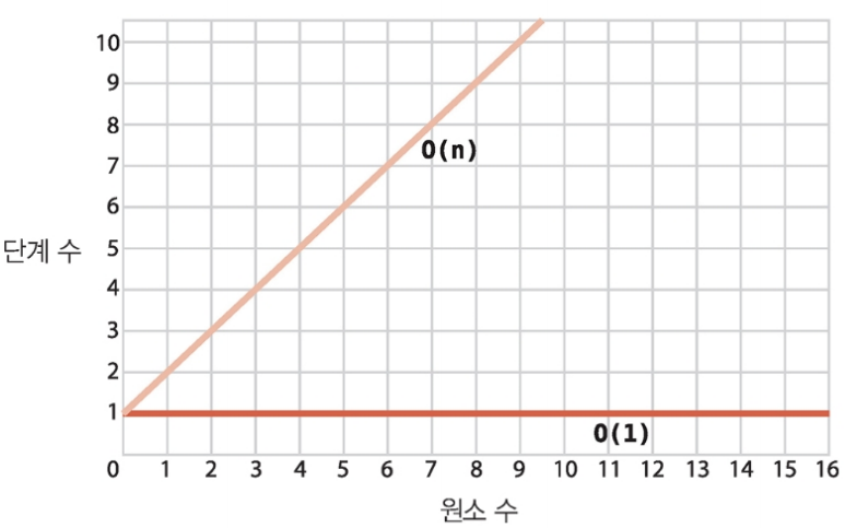 데이터가 늘어나도 O(1) 알고리즘의 단계 수는 증가하지 않는다.