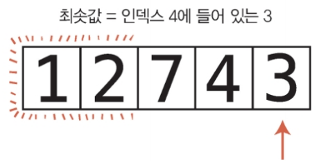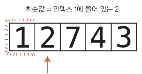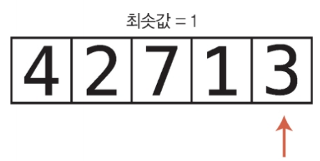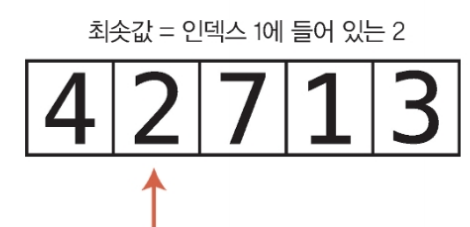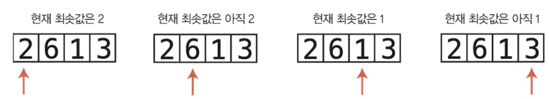 1. 배열의 각 셀을 왼쪽부터 오른쪽 방향으로 확인하면서 어떤 값이 최솟값인지 결정한다. 한 셀씩 이동하면서 현재까지 가장 작은 값을 기록한다.(실제로는 그 인덱스를 변수에 저장) 변수에 들어 있는 값보다 작은 값이 들어 있는 셀을 만나면 변수가 새 인덱스를 가리키도록 값을 대체한다.