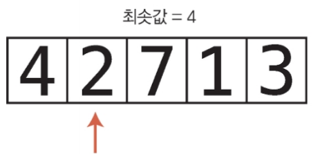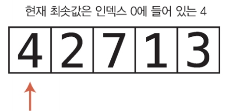 최솟값을 배열 맨 앞으로 옮겼으니 이제 최솟값이 배열 내에 올바른 위치에 있게 되었다.