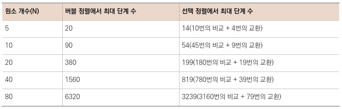 표로 보는 것과 같이 선택 정렬은 버블 정렬 보다 대략 절반 정도의 단계 수를 가지고 있다.