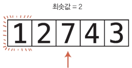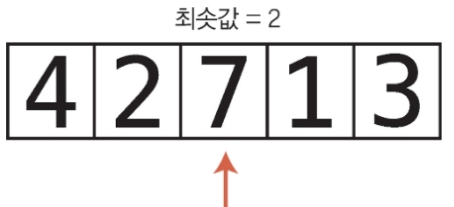 2단계 : 현재 최솟값과 다음 값인 7을 비교한다. 7은 2보다 크므로 2가 여전히 최솟값이다.