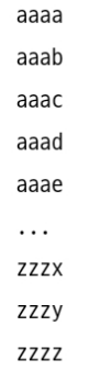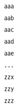 위 함수는 n이 3이라면 aaa와 zzz범위 내 가능한 모든 문자열을 순회한다.