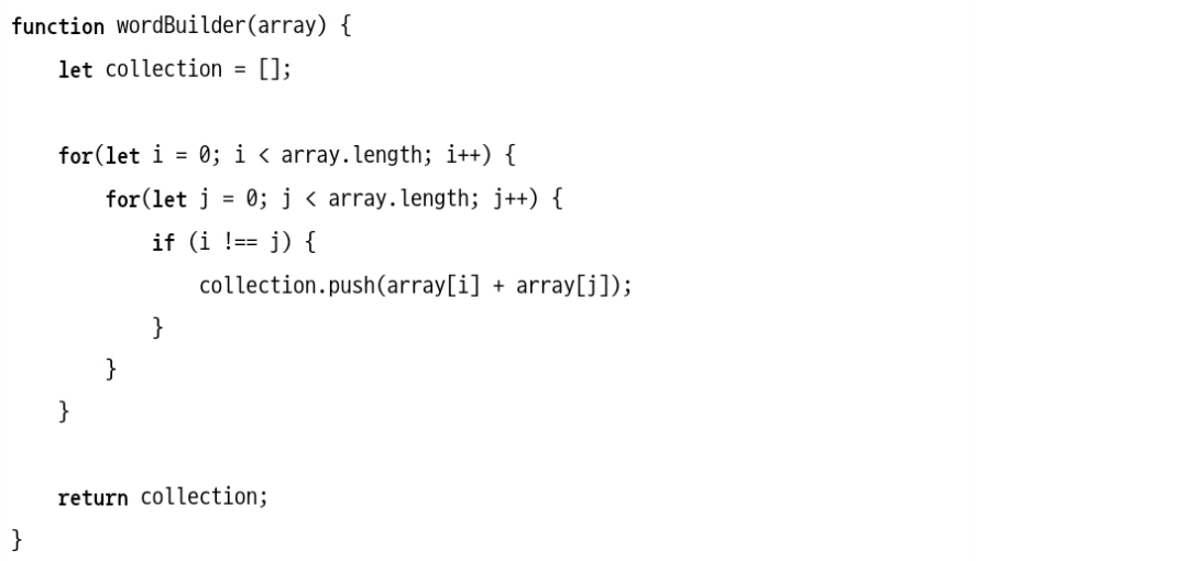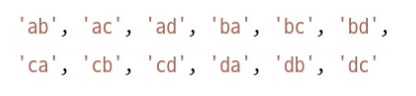 이 예제는 문자 배열로부터 두 글자짜리 모든 문자열 조합을 모으는 알고리즘이다.