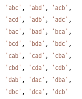 예를 들어, [a,b,c,d]라는 배열이 주어지면 다음과 같은 문자열 조합을 포함하는 새 배열을 리턴한다.