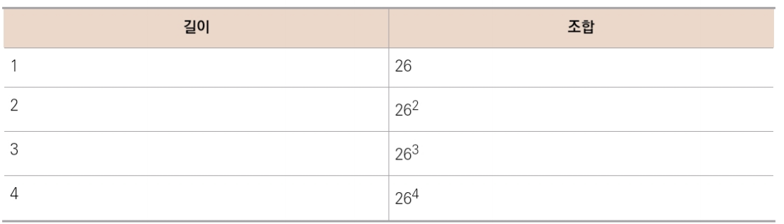 따라서 빅 오 표기법으로는 O(26ⁿ)로 표기한다.