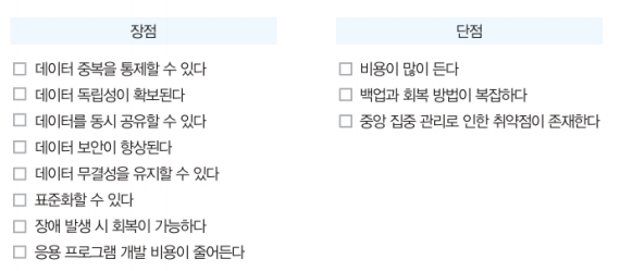 중앙 집중 관리로 인한 취약점이 존재한다.(DBMS에 장애가 발생하면, 전체 시스템 업무처리 중단)