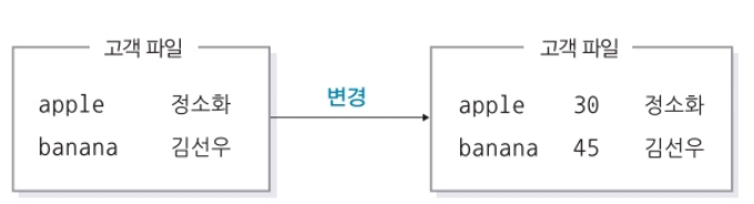 같은 내용의 데이터가 여러 파일에 중복 저장된다. 예를 들어, 고객 관리 담당자는 고객 데이터를 파일에 저장해두고 고객 관리 응용 프로그램을 이용해 고객 관리에 필요한 업무를 처리한다. 마찬가지로 주문 관리 담당자도 주문 내역 데이터를 파일에 저장해두고 주문 관리 응용 프로그램의 도움을 받아 제품 주문과 관련한 업무를 처리한다.