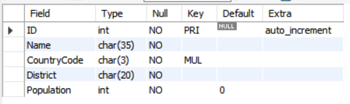 world.city 테이블의 구조를 확인하려면 DESC 명령으로 확인할 수 있다.