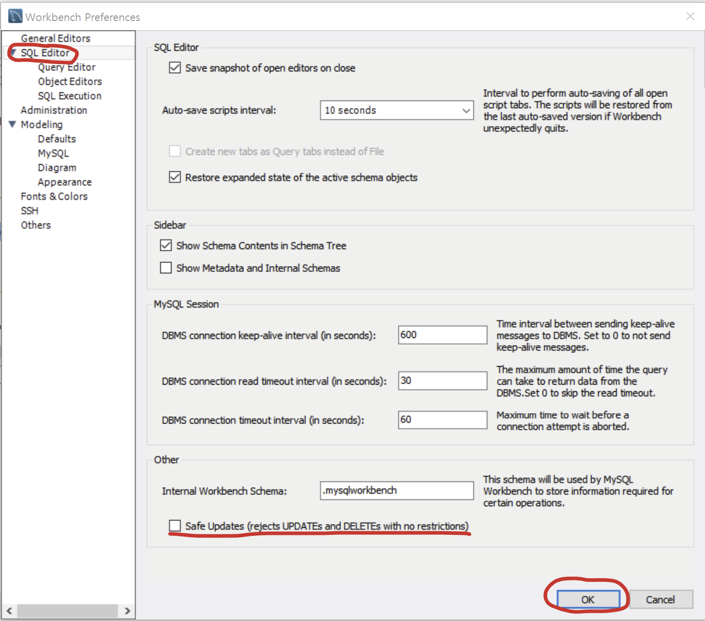 MySQL Workbench 설정 변경 워크벤치에서는 기본적으로 UPDATE 및 DELETE를 허용하지 않기 때문에 설정을 변경해야 한다. 1. 먼저 기존에 열린 쿼리 창을 모두 종료한다. 2. Edit -> Preferences메뉴를 실행한다. 3. 위 그림처럼 밑 줄 친 곳의 체크 박스를 해제하고 OK를 누른다. 4. 워크벤치를 재시작한다.