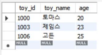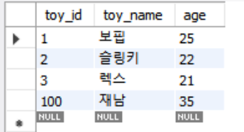 우선 간단한 테이블을 만든다(아이디(toy_id) 열을 자동 증가로 설정)