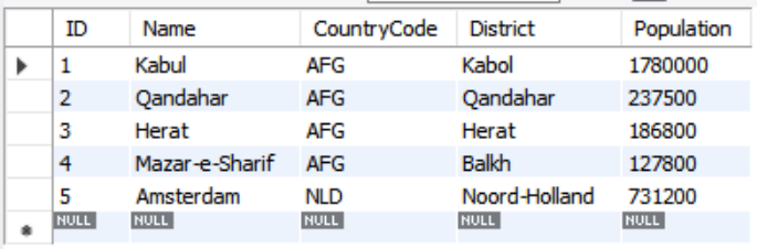 SELECT * FROM world.city LIMIT 5;