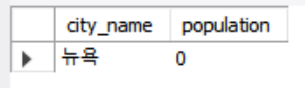 아래는 도시 이름인 NewYork을 뉴욕으로 바꾸면서 인구는 0으로 설정하는 명령이다.